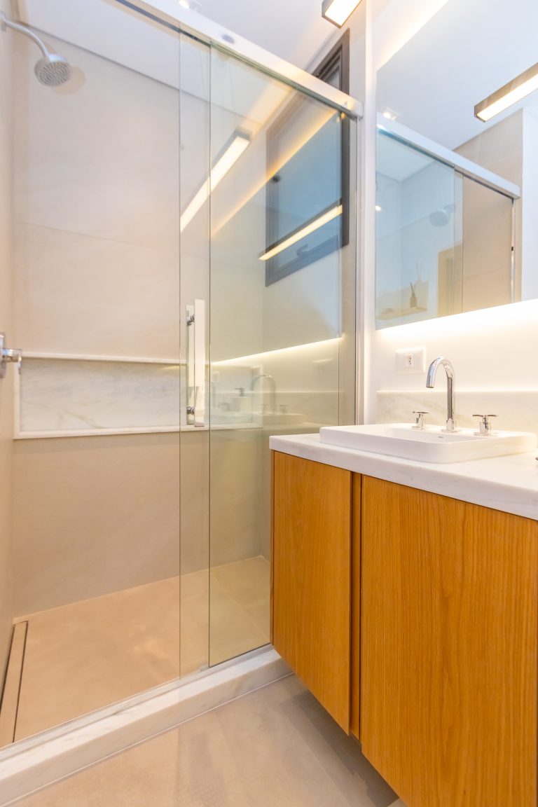 Nichos esculpidos em mármore no box da suíte master