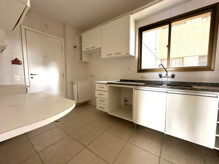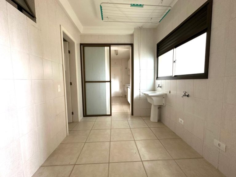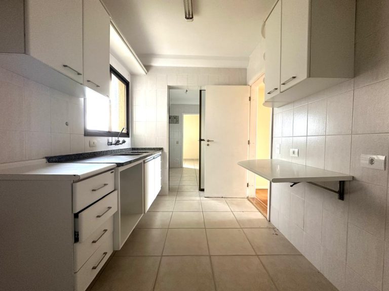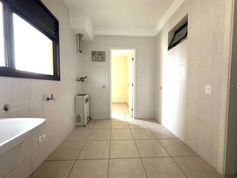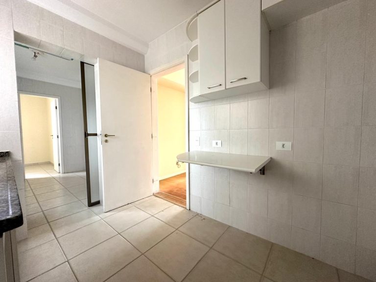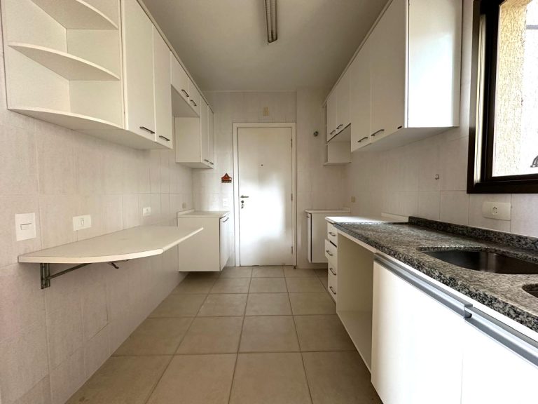 A cozinha conta com armários planejados e acesso a uma lavanderia independente, além de entrada de serviço separada.